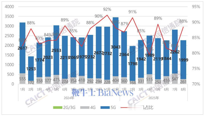 近日,中国通讯院披露国内手机市场总体情况,2025年8月,国内市场手机出货量2260.3万部,同比下降6.0%,其中,5G手机1999.2万部,同比增长1.2%,占同期手机出货量的88.4%。